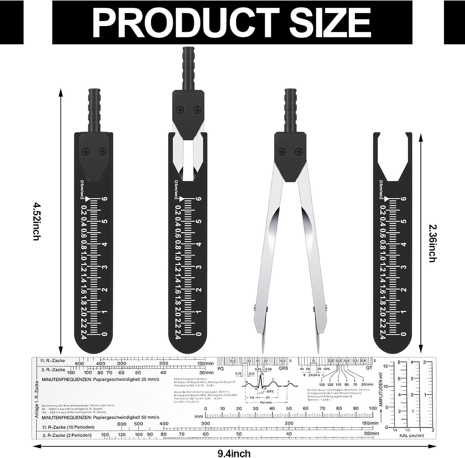• EKG calipers with a scale independent coat, and a transparent ECG ruler, which can be applied to measure ECG waveform.